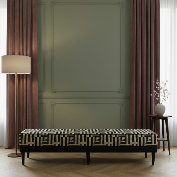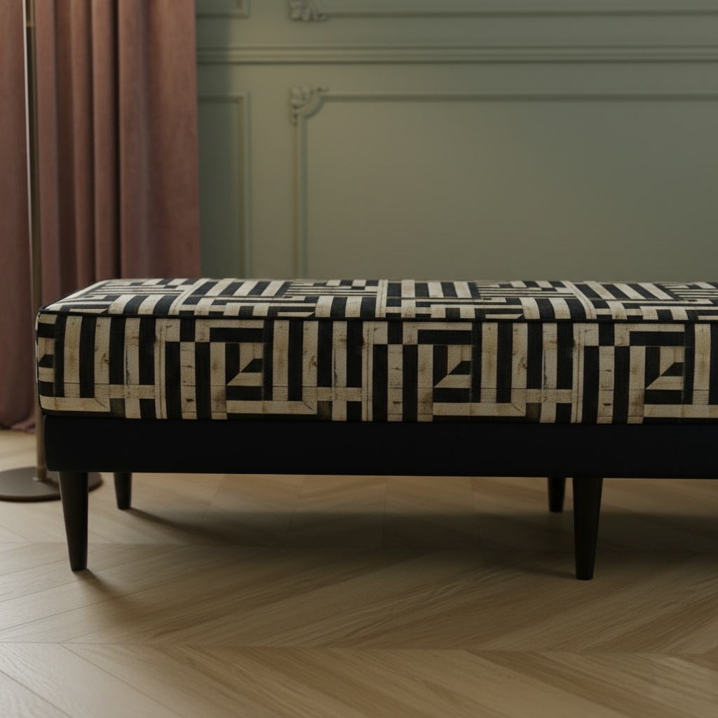Bardini Myth este o banchetă de design care îmbină estetica geometrică modernistă cu eleganța artizanală specifică VLAdiLA. Cu un imprimeu grafic puternic, în nuanțe contrastante de bej și negru, această piesă transformă orice spațiu într-o scenă vizuală echilibrată și plină de caracter. Textura mată a țesăturii și liniile precise ale modelului evocă un limbaj arhitectural contemporan, în care arta și funcționalitatea se întâlnesc armonios.