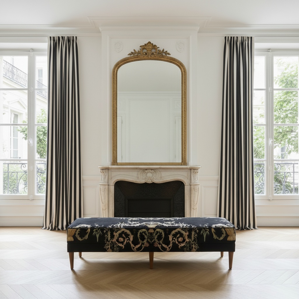 Textura luxuriantă, combinată cu imprimeul de inspirație barocă, face din această banchetă alegerea ideală pentru interioare elegante, holuri sofisticate sau dormitoare cu accente clasice. Liniile fine și motivele delicate creează o atmosferă poetică, în care trecutul și prezentul se întâlnesc într-un dans subtil al frumuseții.