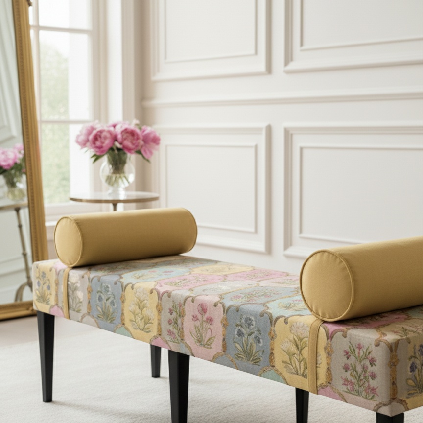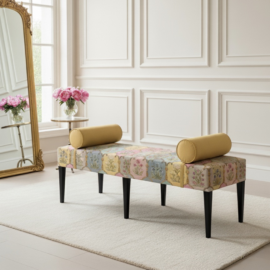 Éclat este o bancă elegantă, inspirată de farmecul clasic francez și reinterpretată într-o viziune modernă VLAdiLA. Tapițeria decorativă cu motive florale pastelate, completată de rolele cilindrice aurii și picioarele subțiri din lemn negru, creează un contrast echilibrat între delicatețe și prezență sofisticată. Această piesă de mobilier adaugă luminozitate și rafinament oricărui interior, fie că este amplasată la capătul patului, într-un dressing sau într-un hol elegant.