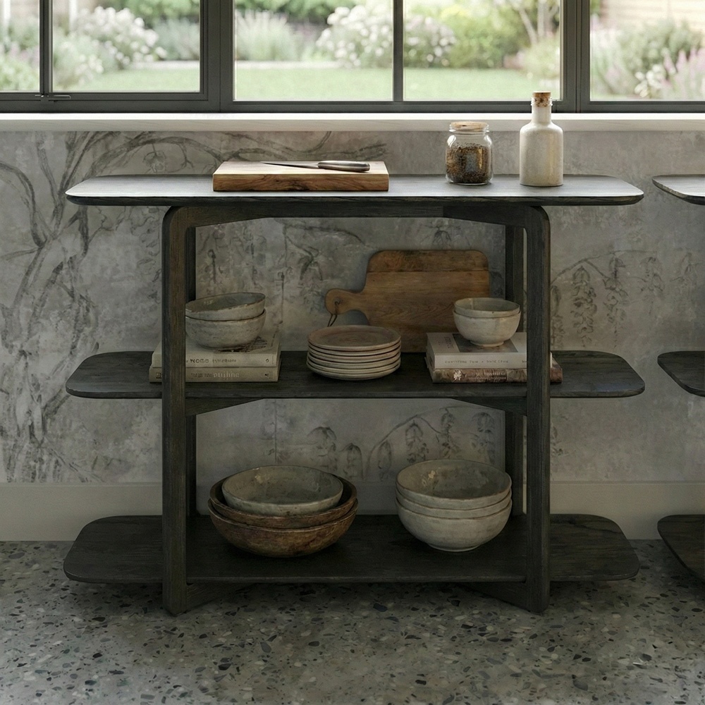 Construită pentru a rezista testului timpului, etajera impresionează prin structura sa solidă din lemn și liniile fluide. Îmbinările subtile și marginile rotunjite oferă un aspect organic, eliminând duritatea colțurilor ascuțite specifice mobilierului standard, integrându-se perfect în amenajări de tip Japandi, Modern Rustic sau Minimalist.