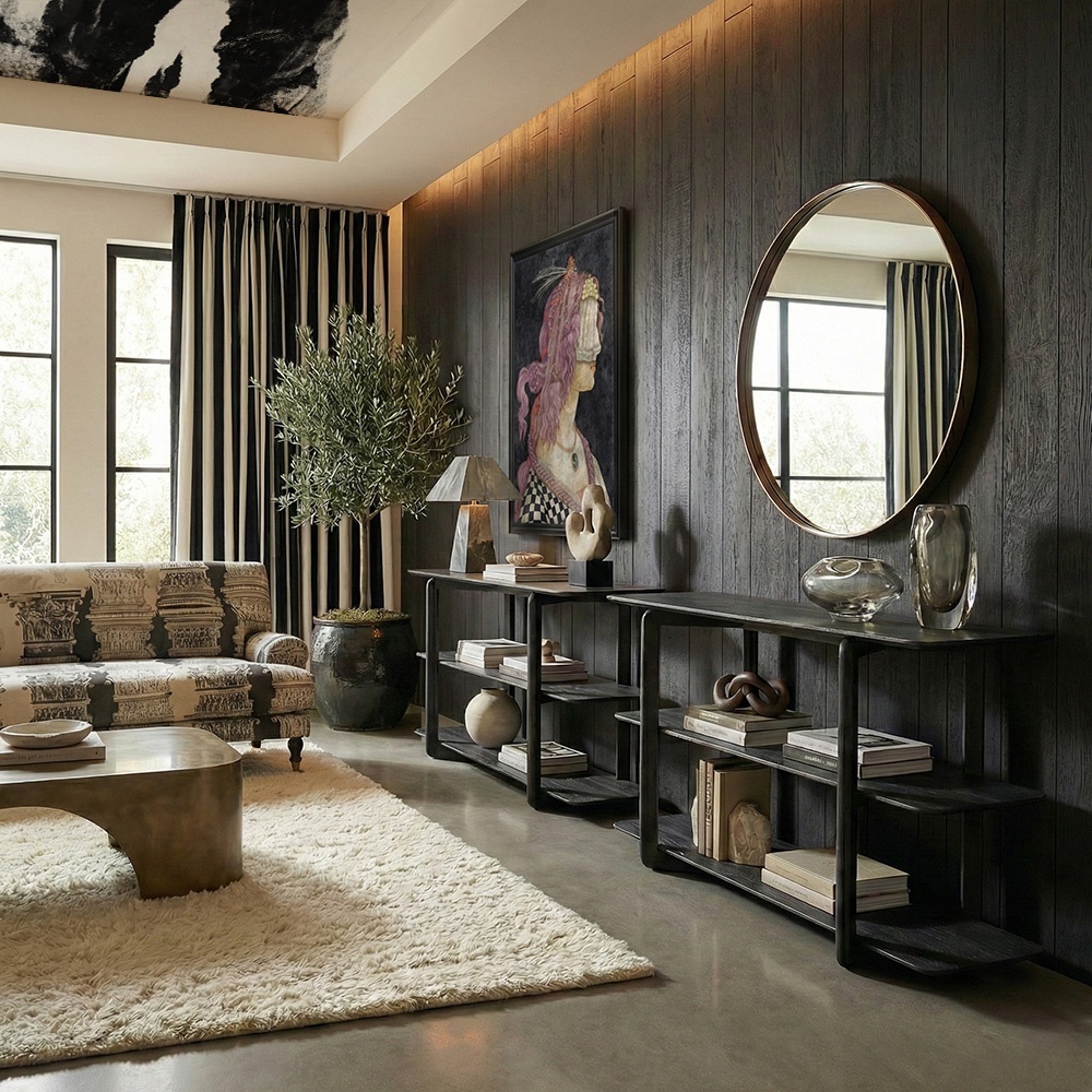 Versatilitatea acestei console din lemn masiv este nelimitată. Într-un decor de living, o poți accesoriza cu o lampă sculpturală, stive de albume de artă și o oglindă rotundă supradimensionată deasupra, pentru a crea un punct focal dramatic.
