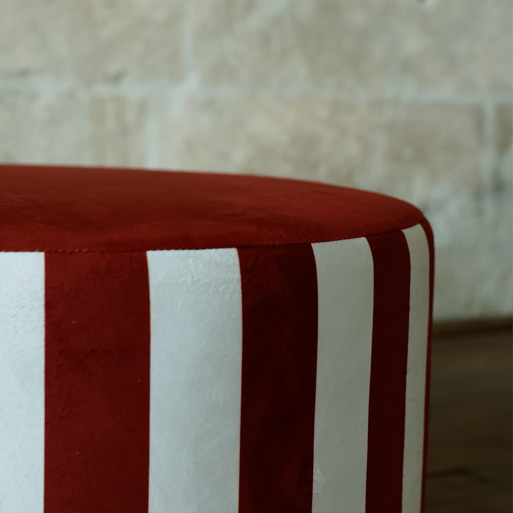 Forma sa cilindrică, compactă și bine proporționată, îl face extrem de versatil – poate fi folosit ca scaun suplimentar, suport pentru picioare sau chiar ca element decorativ central într-un spațiu de living, lounge sau dormitor. Textura moale a materialului adaugă un plus de confort, în timp ce contrastul cromatic creează dinamism și rafinament.
