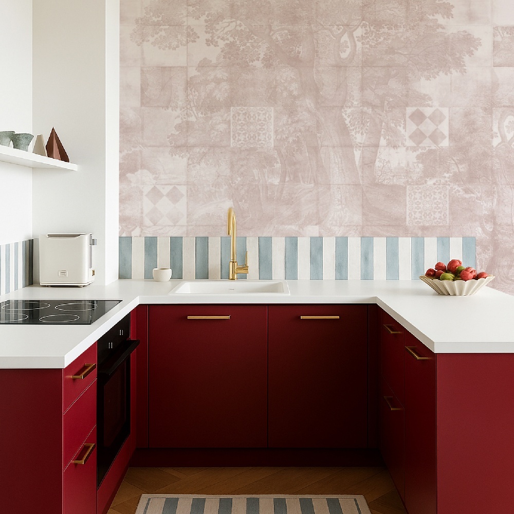 Azure Grove Rose este un mural al calmului poetic. Copacii și peisajele se topesc în nuanțe de albastru și lumină teracotă. Inspirat de serenitatea păduricilor și de măiestria frescelor clasice, acest tapet creează o atmosferă de liniște lirică și rafinament aristocratic.