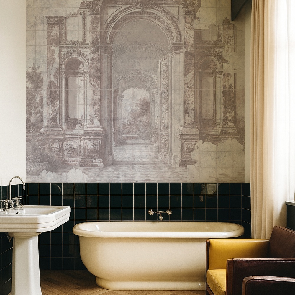 Ideal pentru holuri de intrare, saloane impunătoare sau spații culturale boutique, acest tapet de lux creează o atmosferă de măreție și decadență. Nu este doar un element de decor — este o declarație arhitecturală pictată pe pereții tăi.
