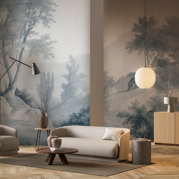 Ethereal Veil este un panou mural care exprimă fineţe şi transcendere. Aici, ceaţa şi lumina topesc peisajele în viziuni onirice. Pictat în degradeuri delicate de albastru, fildeş şi nuanţe de teracotă, acest tapet evocă poezia momentelor efemere surprinse în tuşe.