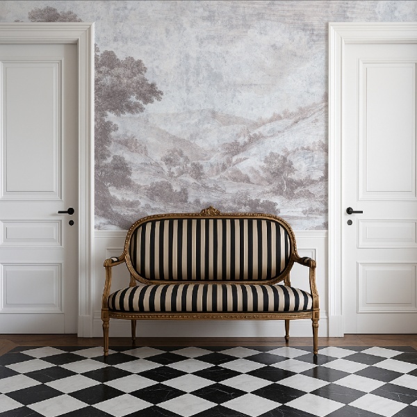 Ca imagine de perete artistică, acest mural întruchipează esența tapetului de lux: este o declarație realizată manual, care îmbogățește interiorul cu subtilitate și măreție. Liniile fluide și paleta armonioasă invită la contemplație. Oferă nu doar plăcere estetică, ci și rezonanță emoțională.