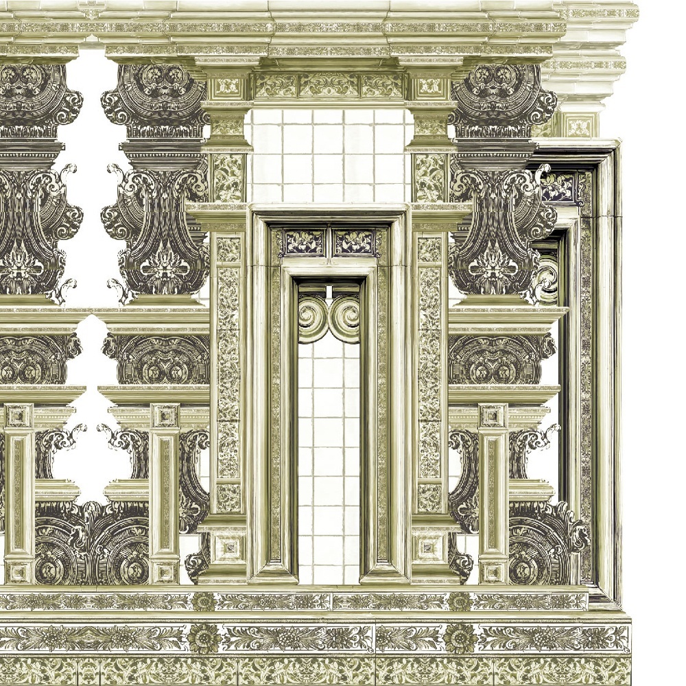 Ornamental Cathedral Cream este punctul culminant al colecției — un mural de arhitectură monumentală, unde coloanele, arcadele și ornamentația barocă se înalță într-o splendoare poetică. Acest tapet transformă măreția sacră în grandiozitate interioară.